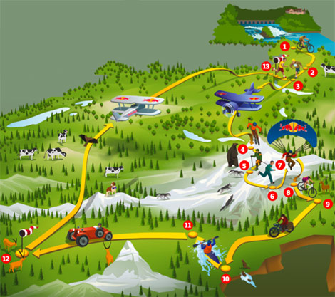 Gestartet wird beim Rheinfall. Während sich der Rhein 23 Meter in die Tiefe stürzt, warten 34 Fahrrad- Fahrer ungeduldig auf den Start der Red Bull Jungfrau Stafette. Jedes Team besteht aus 13 tollkühnen Protagonisten.