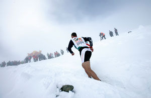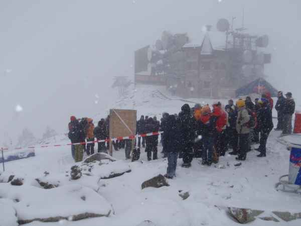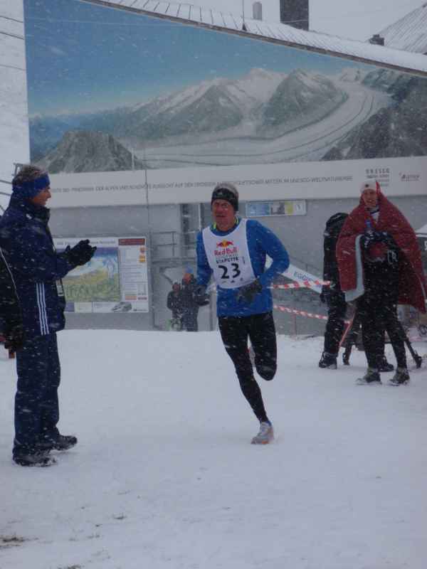 An der Grenze zum Grauen des Gletschers, dann die Übergabe an den Gletscherläufer. Mit seinen Spikes gibt er dem Berg die Sporen. Die Route führt von der Konkordiaplatz zum Märjelensee. Für die 8 Kilometer werden ca. 80 Minuten benötigt. Der Bergläufer wartet schon gespannt auf seinen Kollegen. Die Kälte, der Zug des Windes gestaltet ein Warten unangenehm. Die Bergläufer sind sich der Gefahr bewusst die auf der Route wartet. Die Risse im Boden, die spitzen Felsen machen diesen Abschnitt zu einer ganz besonderen Herausforderung. Dann endlich, die Übergabe am Eggishorn ( Bergstation ).