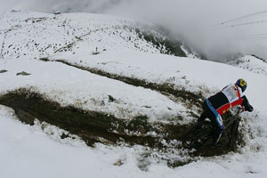 Die Gleitschirmpiloten machen sich bereit für den Sturz in die Tiefe Richtung Fiescheralp ( Mittelstation ). Die Windverhältnisse sind alles andere als angenehm. Dieser Flug ist nur absoluten Profis vorbehalten. Scheinbar mühelos schweben die Helden den warteten Bikern entgegen. Das Band muss per Abwurf möglichst nahe an den Biker geführt werden um Verzögerungen zu vermeiden. Die Flugzeit beträgt für die 4 km Luftlinie ca. 10 Minuten.